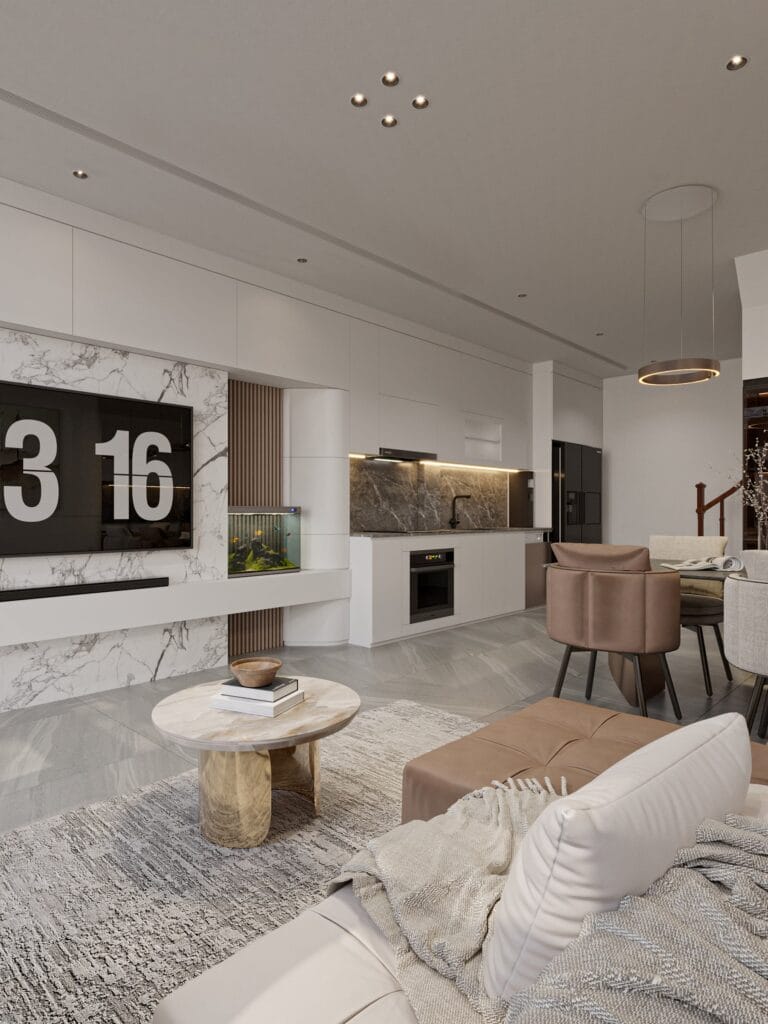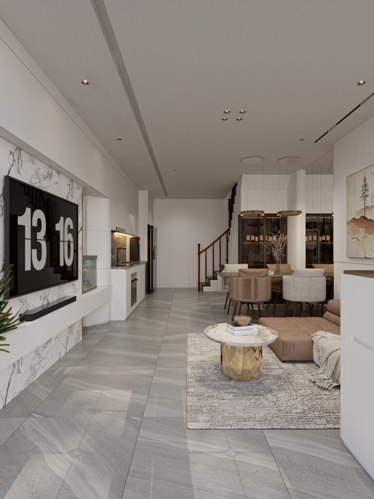 • Khu vực tiếp khách và bếp ăn được kết nối liền mạch, thuận tiện cho sinh hoạt chung.