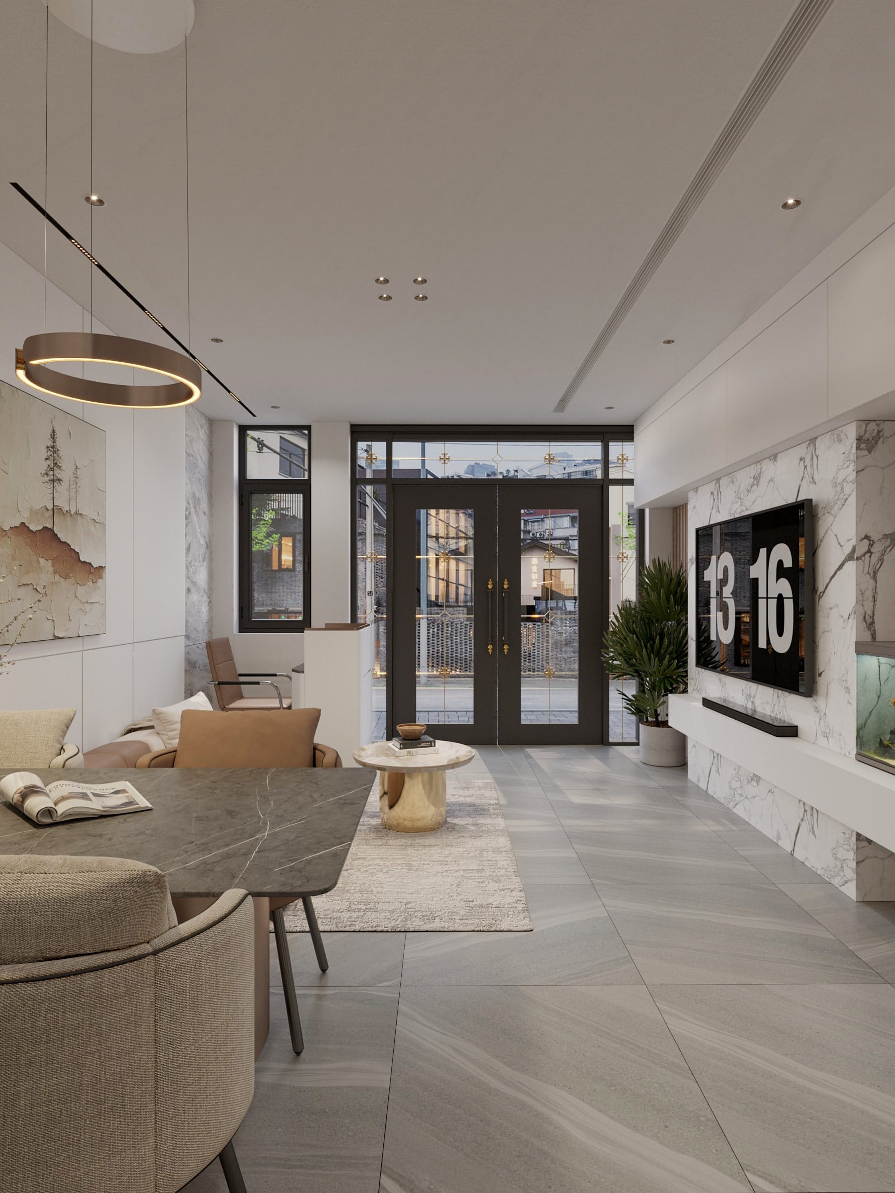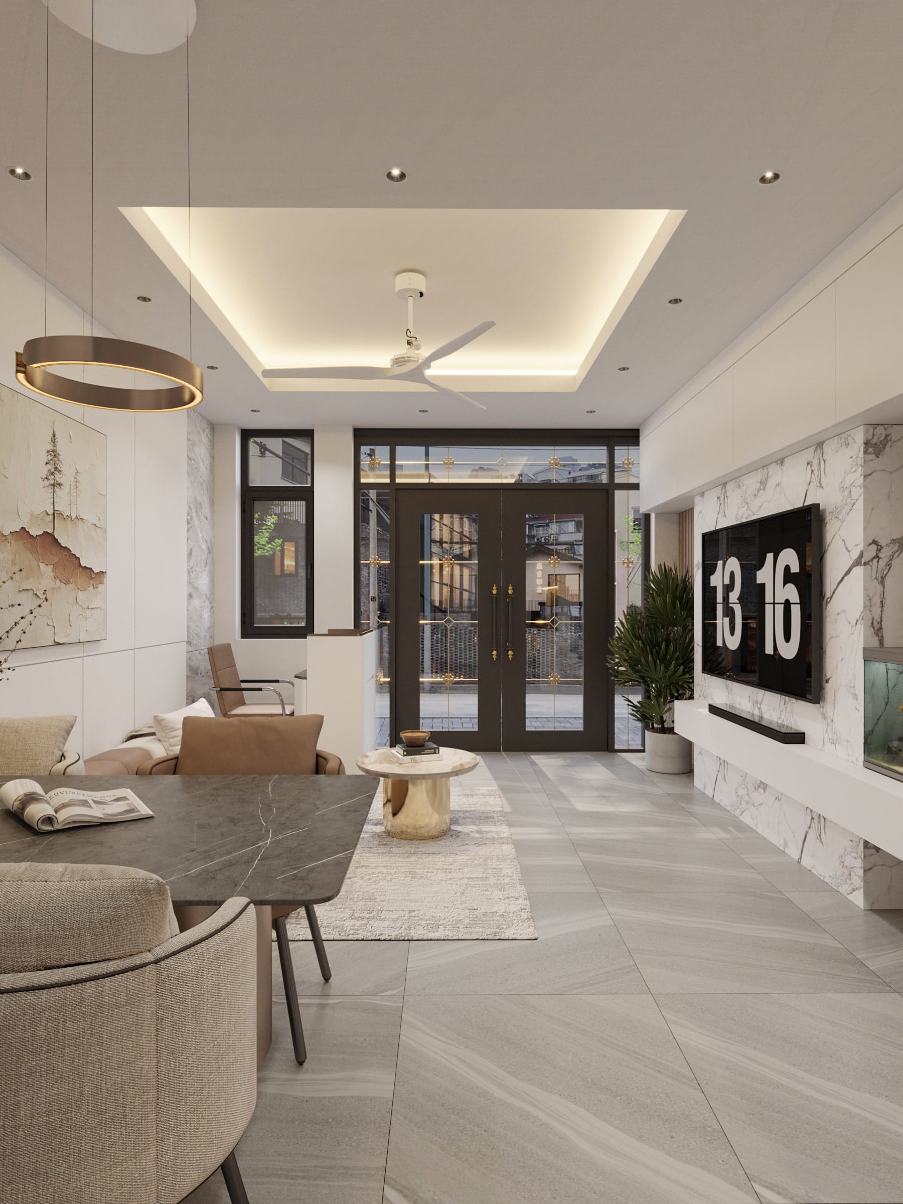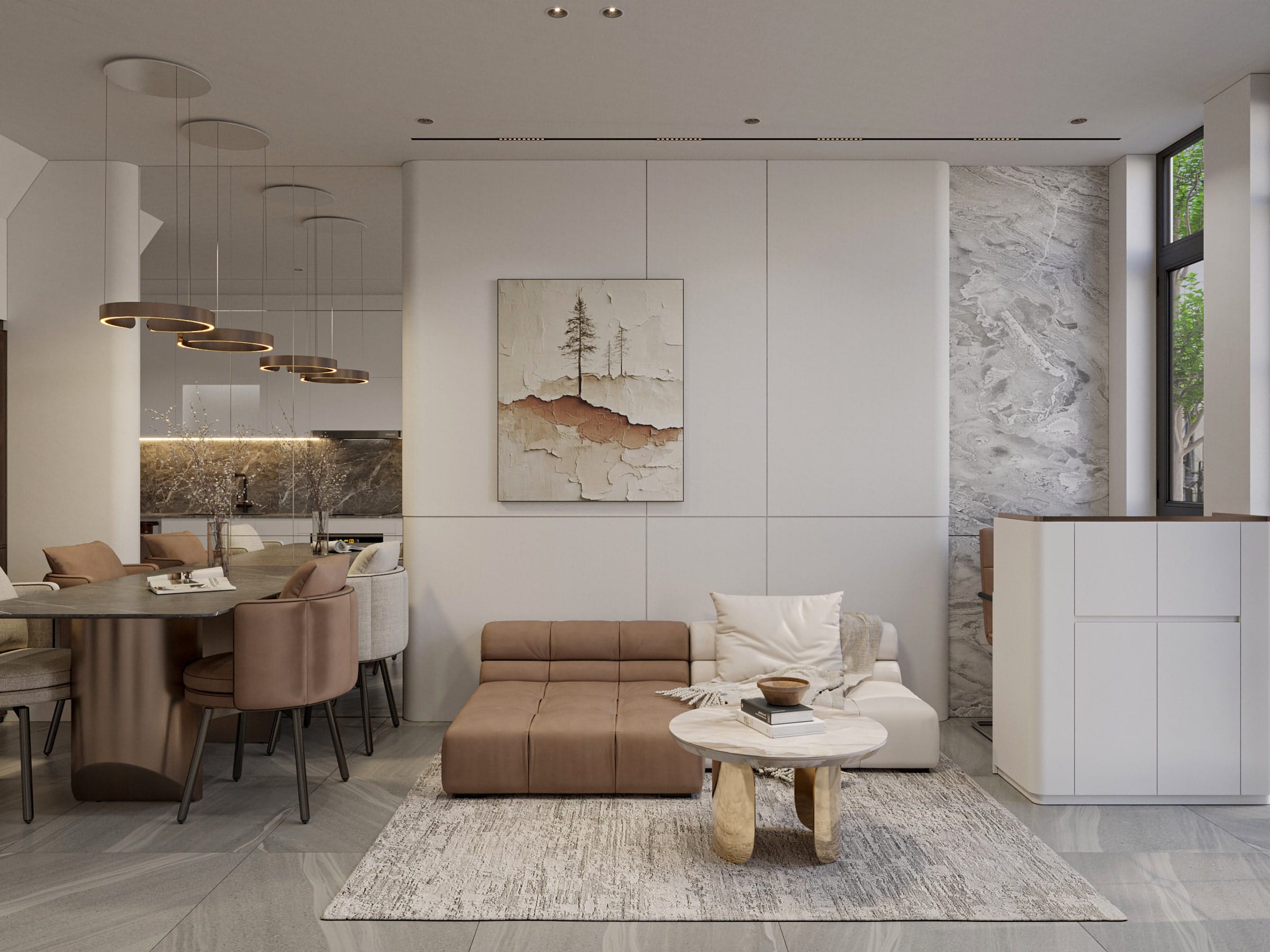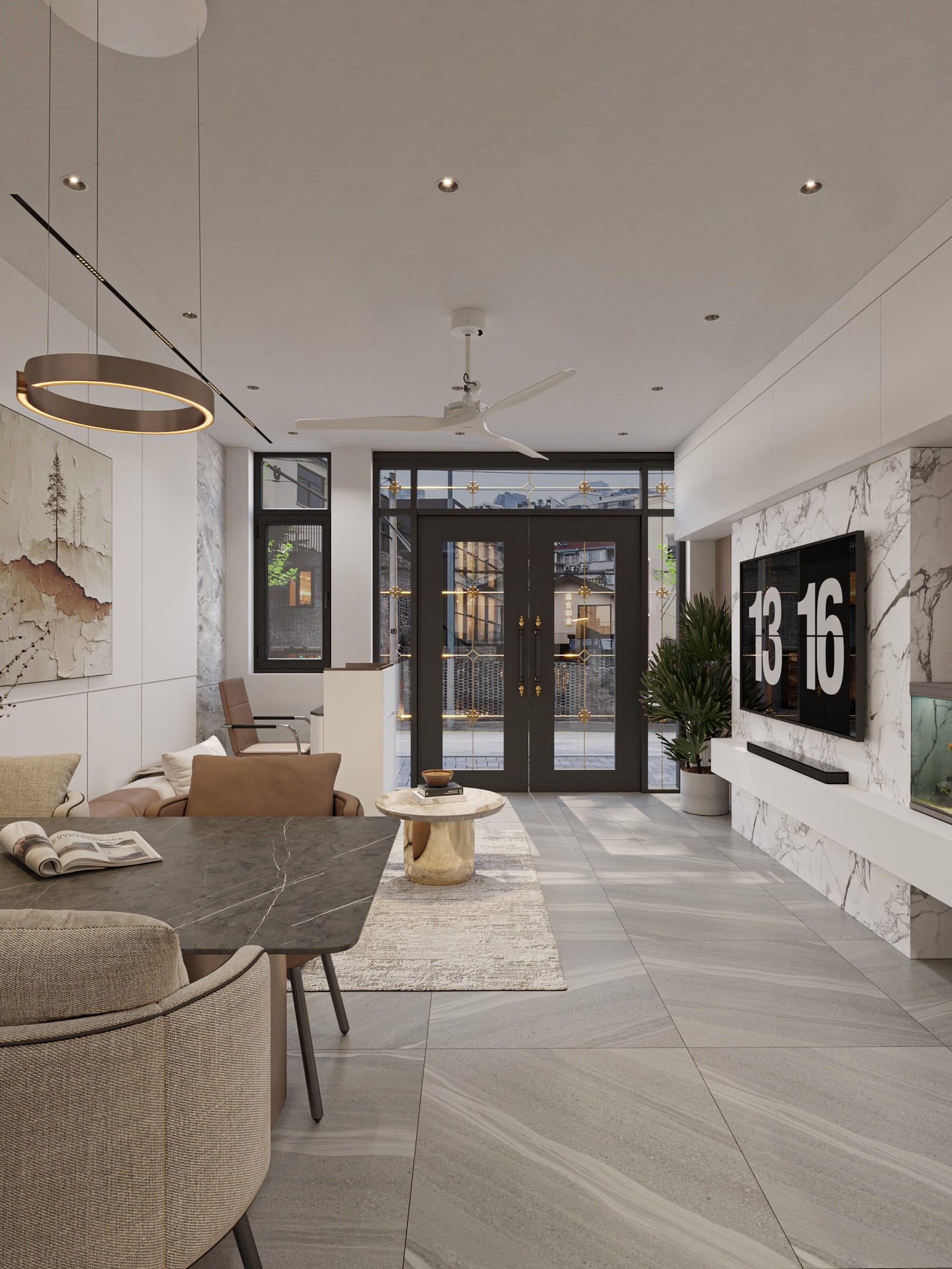 • Tận dụng tối đa ánh sáng tự nhiên với hệ cửa kính lớn, kết hợp rèm nhẹ nhàng để điều chỉnh ánh sáng linh hoạt.