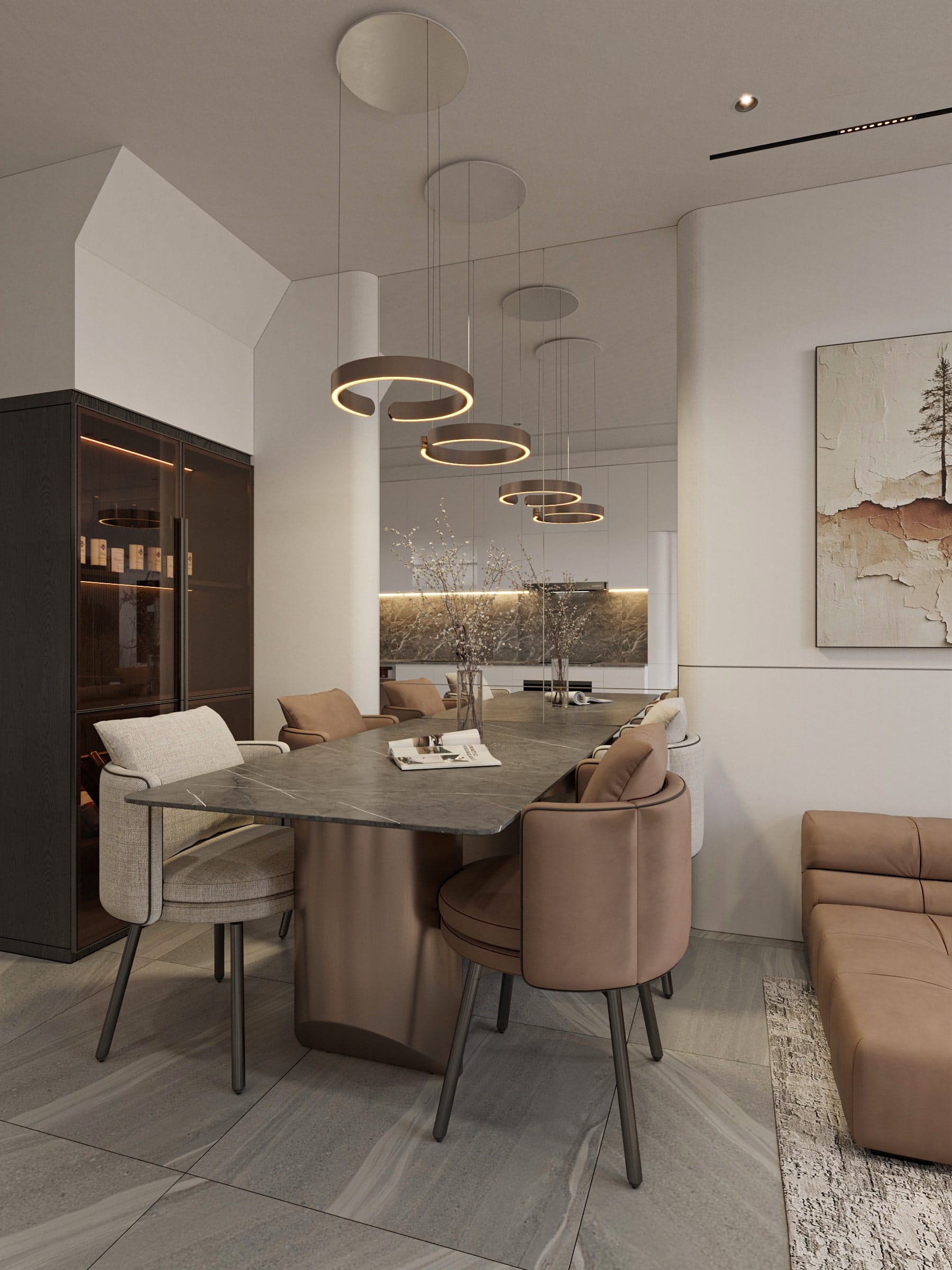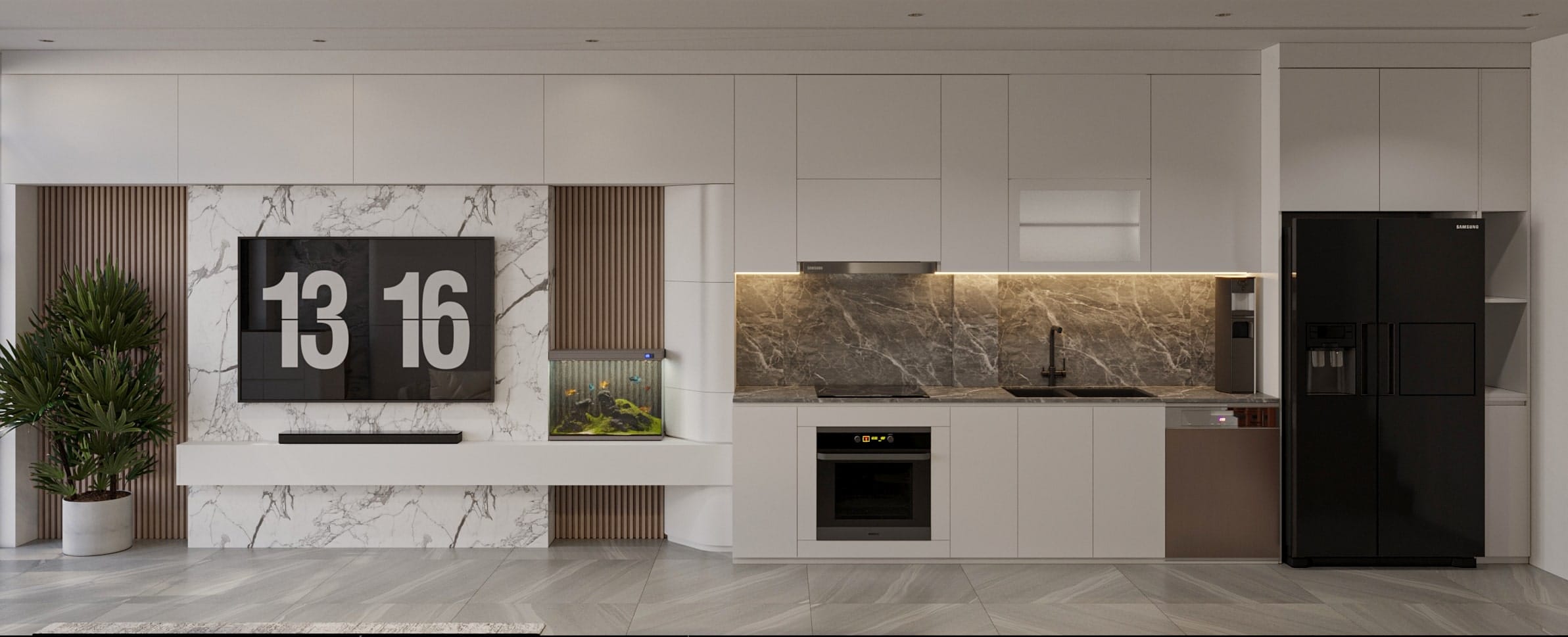 • Thiết kế hệ tủ âm tường đa năng giúp tối ưu diện tích lưu trữ mà không làm rối mắt không gian.